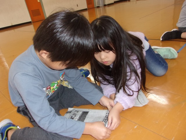 今日の宗谷地方は暴風が心配されていますので、1日防災学校も計画を変更しながら実施することとしました。写真は1年生による「新聞紙スリッパづくり」のようすです。枝幸警察署より講師をお迎えしました。「できた~」と嬉しそうにスリッパをはきました。1年生の足には、少々大きなスリッパでしたね(#^^#)