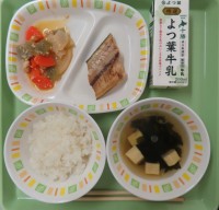 ☆ご飯☆高野豆腐とわかめのすまし汁☆ほっけ焼き魚☆肉みそおでん☆牛乳~おはなし給...