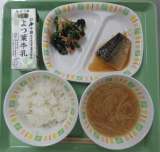 ご飯、厚揚げともやしのみそ汁、さばのみそ煮、ほうれん草チーズおかか和え、牛乳
