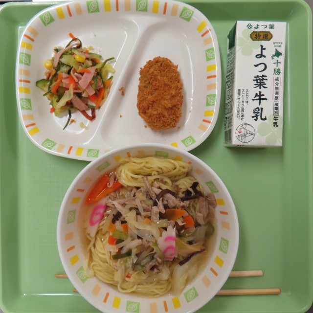 ☆塩ラーメン☆南瓜コロッケ☆げんきサラダ☆牛乳~おはなし給食5日目は「サラダでげんき」(作 角野英子/出版 福音館書店)から【げんきサラダ】です。動物たちにアドバイスをもらいながらサラダを作る女の子の... 2025/10/31 給食